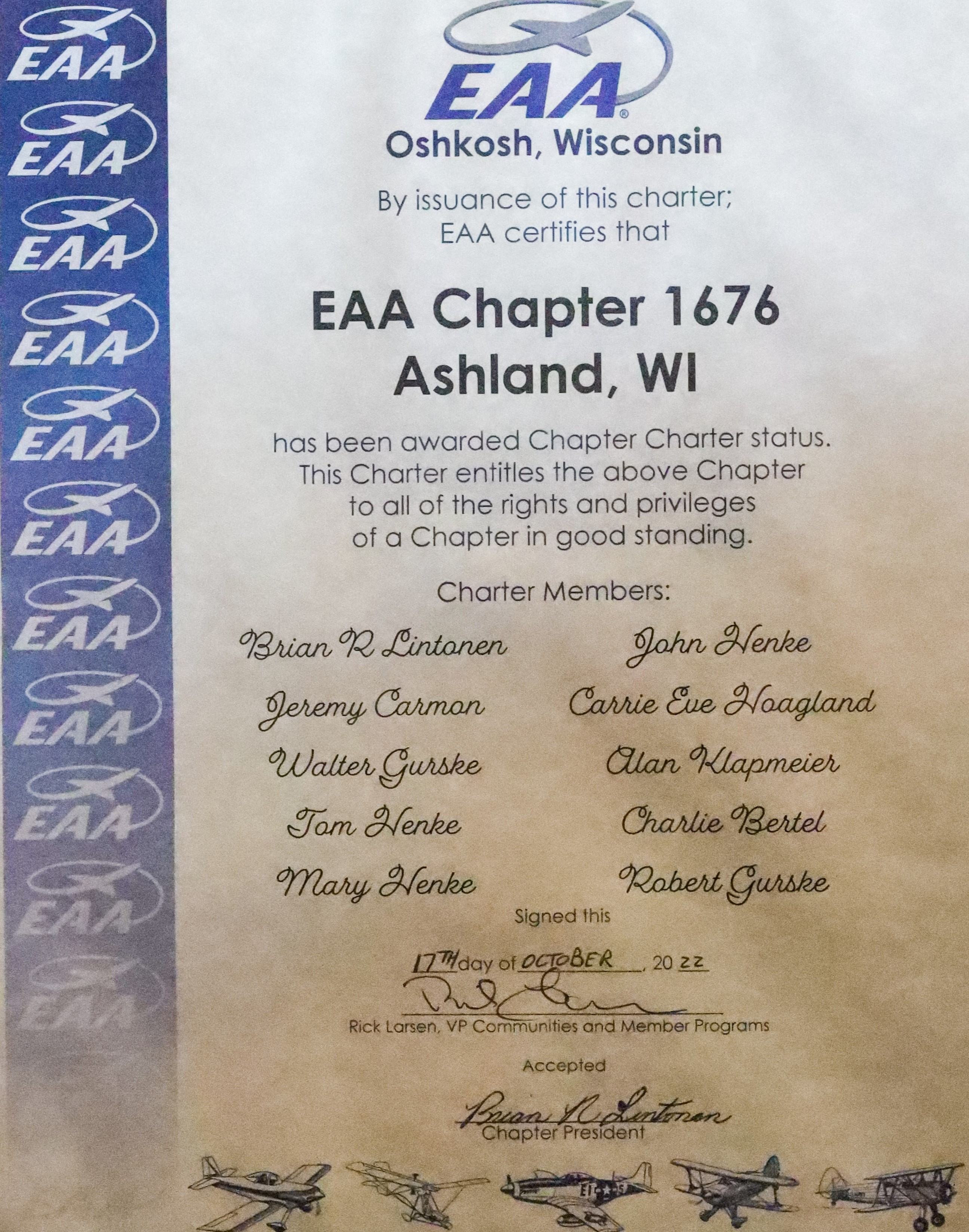 EAA Chapter 1676, the JFK Memorial chapter, was established in 2021 with ten charter members. Founded with deep roots in the military and law enforcement, the chapter carries a sense of purpose and duty to the Ashland area community. In the years to come, as our membership grows, we hope to be a example of service in the aviation community as we serve in the Ashland, WI area.